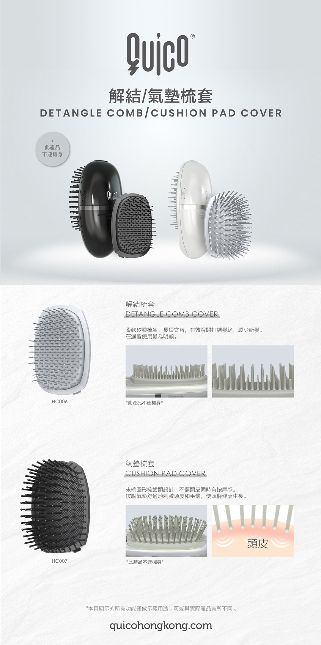 The QUICO Cushion Pad Cover can be used along with the QUICO Detangle Brush (HC307). The Cushion Pad Cover & the Detangle Comb Cover are interchangeable.