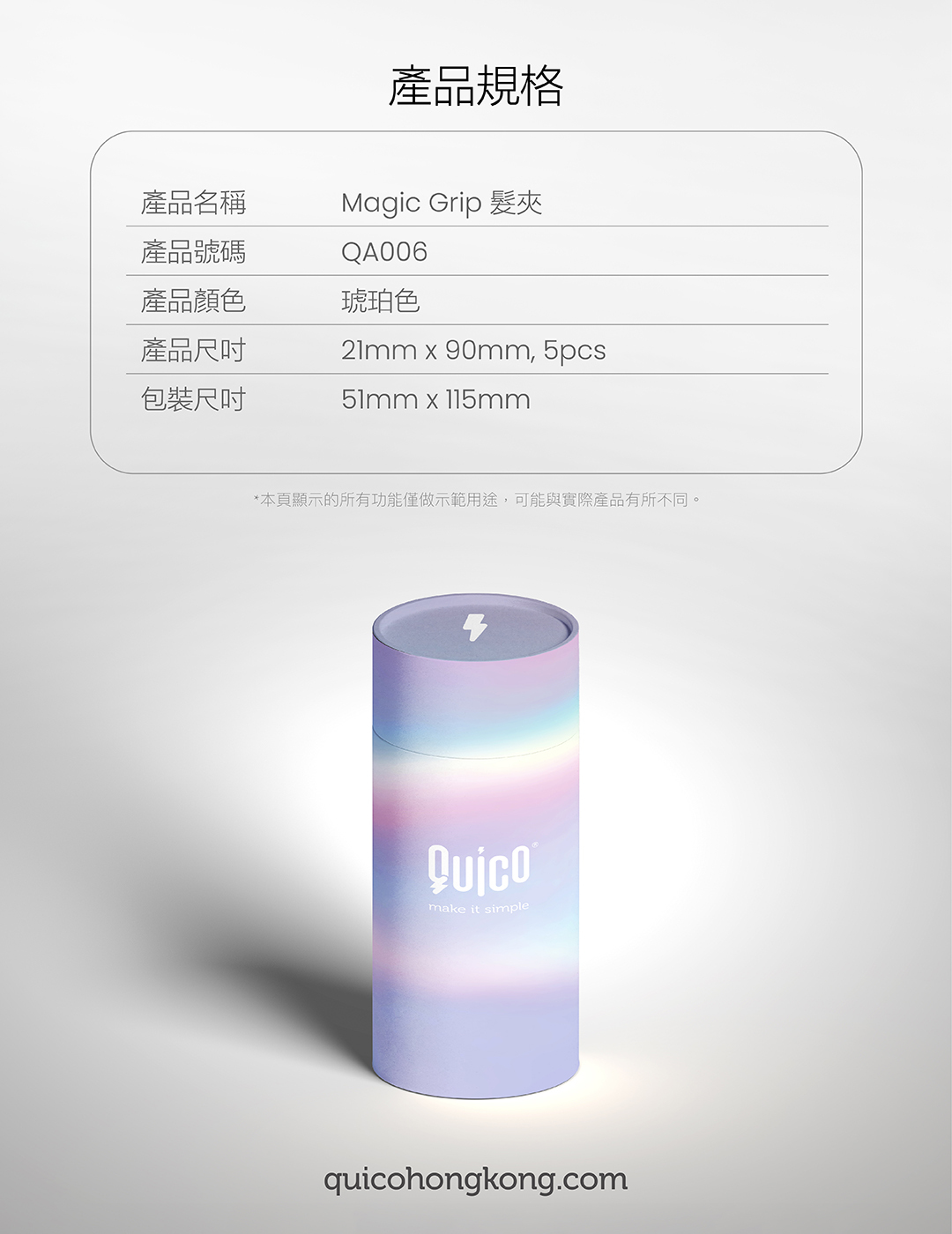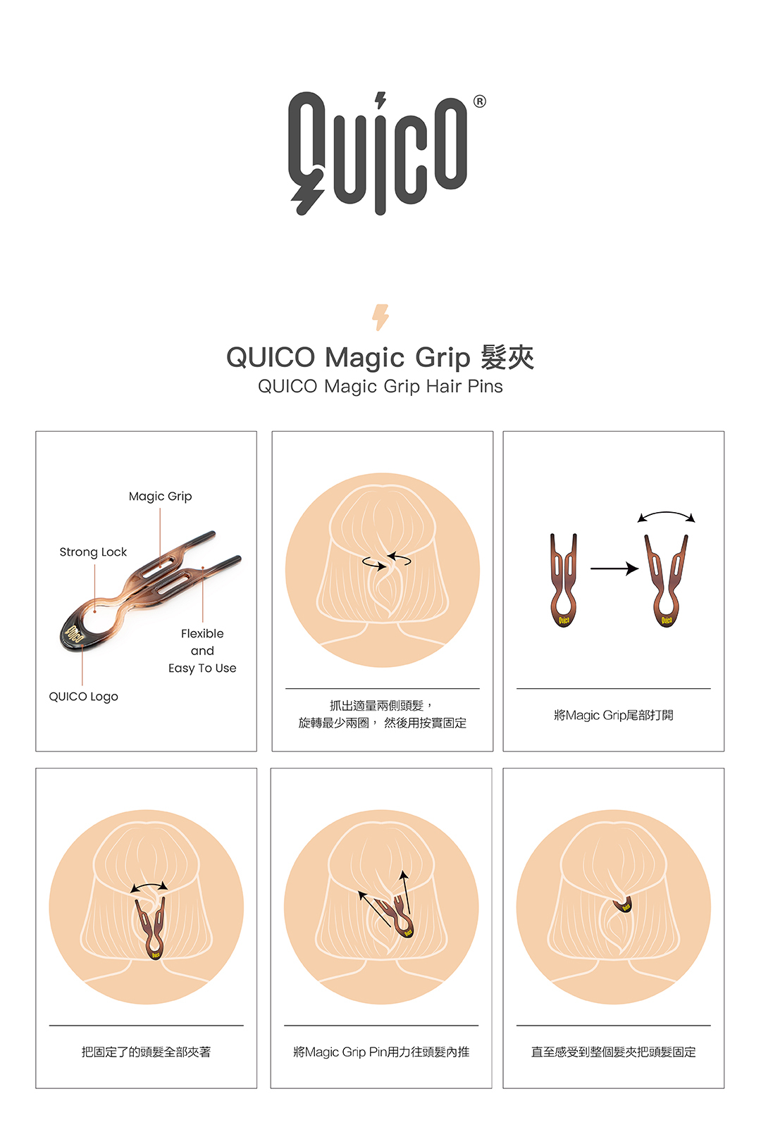 創新曲線設計、靈活性且穩固、追求極致無痛、無痕的 QUICO Magic Grip 髮夾 新登場!它的固定力至少是一般髮夾的5倍以上。由於其曲線形狀,髮夾舒適地固定在您的頭髮中,整天都不會感到不舒服。這款髮夾使用起來簡單方便,不會損壞您的頭髮,也不會留下任何折痕。