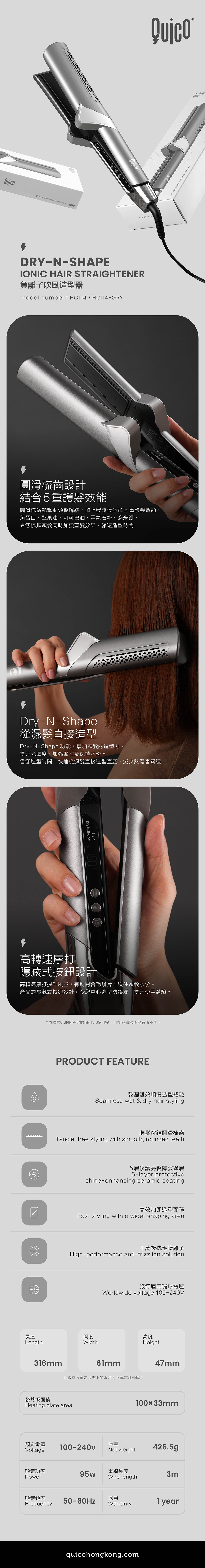QUICO Dry-N-Shape 負離子造型器,濕髮直接造型,一機搞定。15秒預熱 + 百萬負離子 + 5重護髮塗層,一機完成吹乾拉直,省時同時鎖水抗毛躁,打造光澤彈性直髮!
