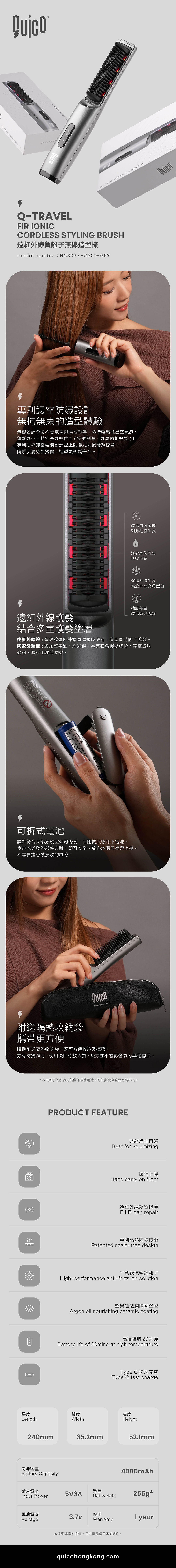 每天早上趕出門,頭髮卻毛躁亂翹?去旅行想帶造型梳,卻又擔心無法登機?QUICO Q-Travel 遠紅外線負離子無線造型梳正是為解決這些煩惱而生。它採用專利「中空結構設計」及航空級可拆式電池,在造型時能有效防止燙傷,安全便攜。