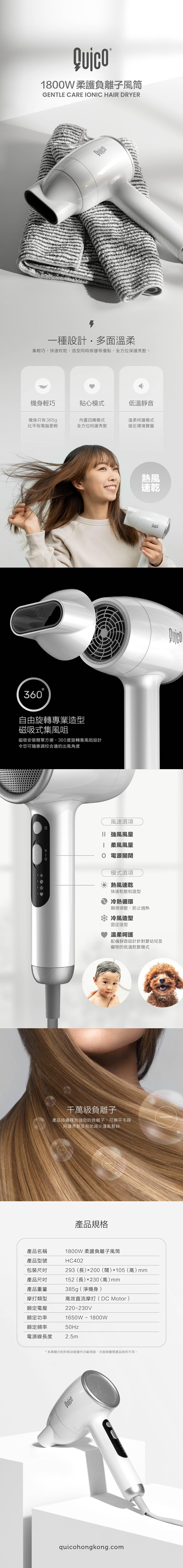 產品名稱:QUICO 1800W 柔護負離子風筒