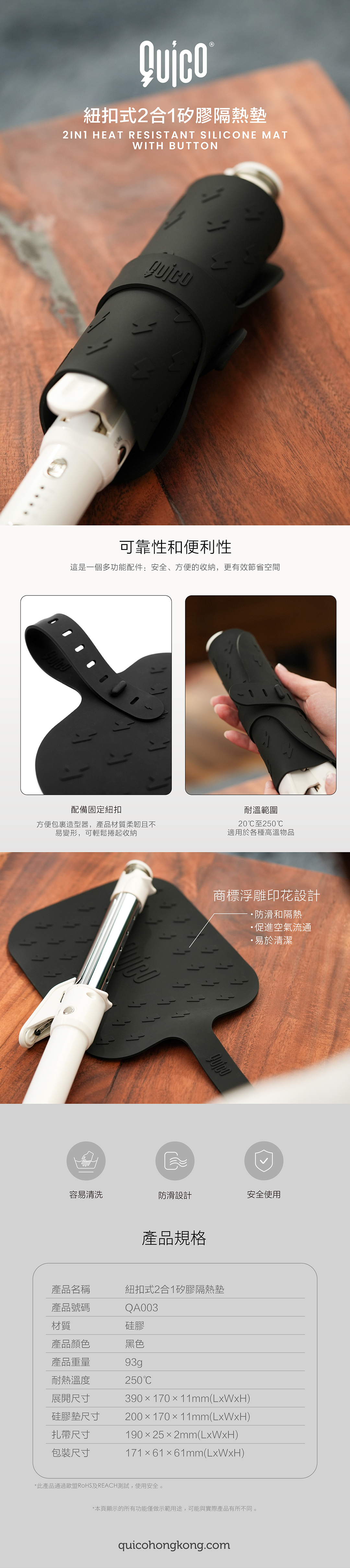 體驗 QUICO鈕扣式2合1矽膠隔熱墊 - 可靠性和便利性。這是一個多功能配件:安全、方便的收納,更有效節省空間。