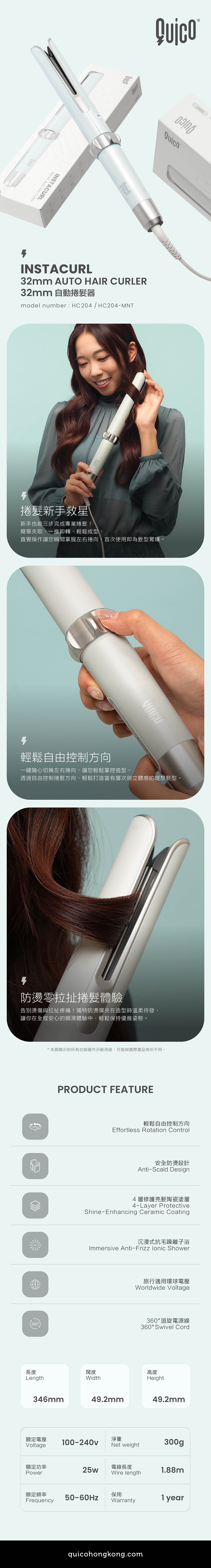 QUICO InstaCurl 32mm自動捲髮器,創新防燙彈夾與一鍵左右捲向設計,簡單三步完成專業造型。直覺操作讓新手也能輕鬆打造層次捲髮,享受零拉扯、零燙傷的安心體驗。