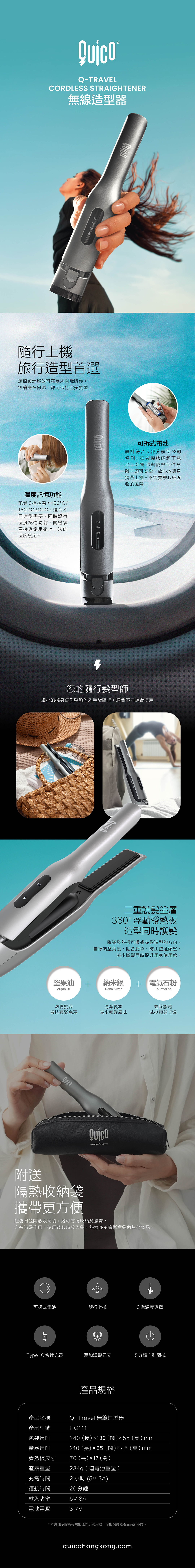 QUICO Q-Travel 無線造型器 可拆電設計 符合絕大部分航空公司條例,只需在關機的狀態下就可以將電池卸下,輕鬆將電池與發熱部件分離,再放入手提行李。不需要擔心被沒收的風險,可以安全、放心地隨身攜帶上機。